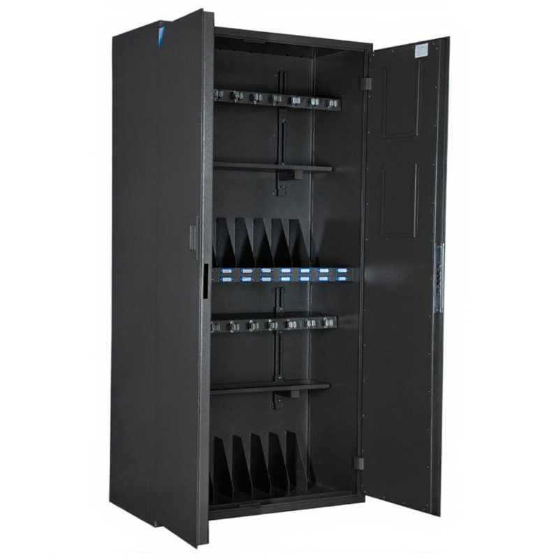 Оружие устанавливается перед полками под магазины, фиксируется удобными металлическими держателями с резиновыми роликами. Высота установки планки с держателями — регулируемая, за счет чего обеспечивается возможность хранения оружия различной длины. На внутренней стороне дверей — рамки под списки. Под приклады — ковролиновый коврик.
