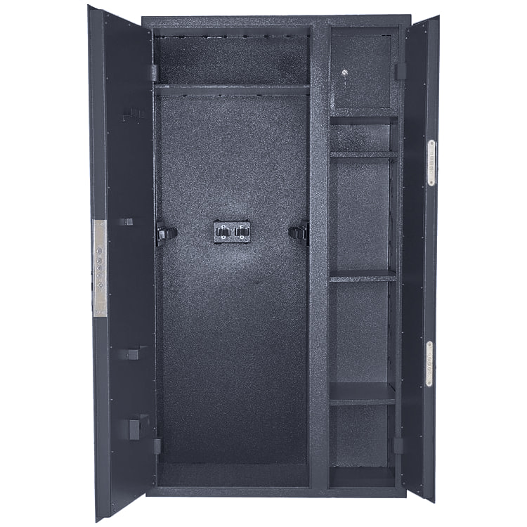Армейский двухсекционный оружейный шкаф ОШ-163 для надлежащего хранения 16 единиц оружия. Отвечает всем требованиям МВД РФ к условиям безопасного хранения оружия, предназначен для юридических лиц. Взломостойкие качества подтверждены сертификатом соответствия сейфовым стандартам ГОСТ Р 55148-2012.
