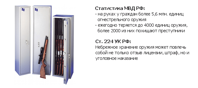 По данным МВД России, официально на руках у российских граждан находится более 5,6 млн. единиц огнестрельного оружия. Однако, не все владельцы соблюдают необходимые требования для надлежащего его хранения. Ежегодно теряется до 4000 единиц оружия, более 2000 единиц похищается злоумышленниками.